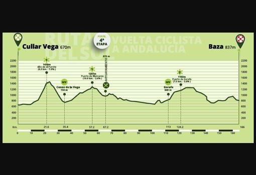 Cuarta etapa: Cúllar Vega (Granada) – Baza (Granada). 167,4 kilómetros. Sábado 19 de febrero. Interesante perfil con puertos de entidad lejanos a la meta