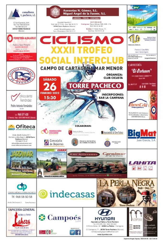 Torre Pacheco acogerá el sábado, a partir de las 15.30 horas, la cuarta etapa del XXXII Trofeo Social Interclub Campo de Cartagena-Mar Menor. La prueba contará con 85 kilómetros de recorrido. Lista de participantes