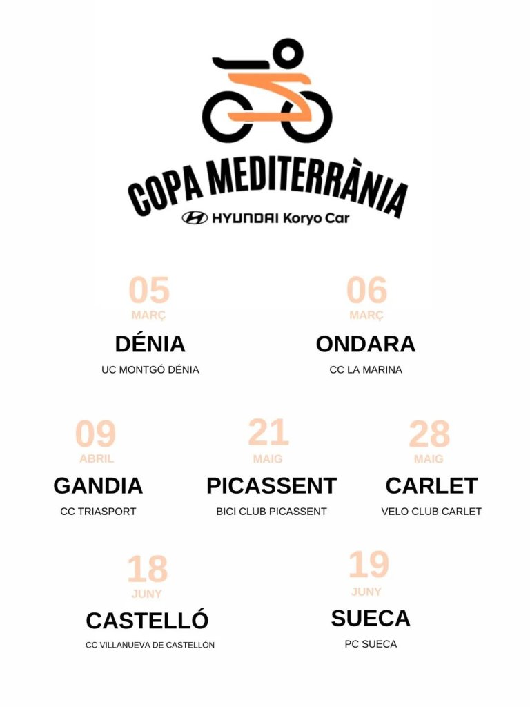 La Copa Mediterrània – Hyundai Koryo Car femenina, formada por pruebas de carácter nacional, arrancará el próximo 5 de marzo en Dénia y finalizará el 19 de junio en Sueca. El resto de puntuables serán en Ondara (6 de marzo), Gandia (9 de abril), Picassent (21 de mayo), Carlet (28 de mayo) y Castelló de la Ribera (18 de junio), esta última en modalidad contrarreloj individual.