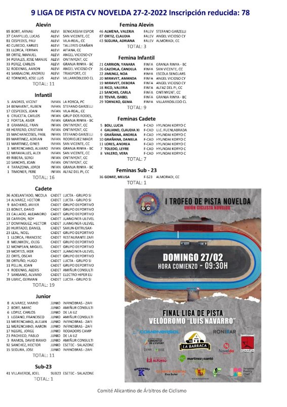Mañana domingo, si el tiempo lo permite, a las 9:30, se producirá la inauguración en competición del Velódromo Luis Navarro. Un día histórico para Novelda después de años de espera. LISTA DE INSCRITOS