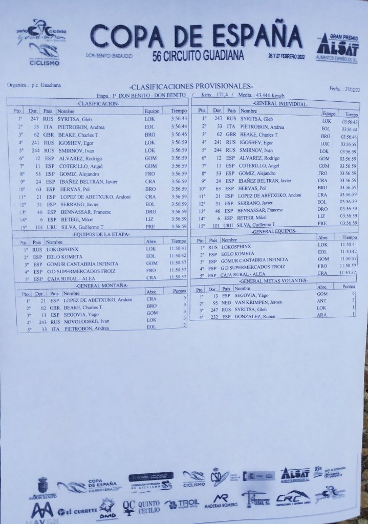 Gleb Syritsa (Lokosphinx) se ha impuesto en Don Benito en el 56 Circuito del Guadiana, primer prueba de la Copa de España Élite y Sub 23. Su tiempo ha sido de tres horas, 56 minutos y 43 segundos. Andrea Pietrobon (Eolo) ha entrado a continuación y el corredor del Brocar Alé, Charles Beake ha completado el podio. Alejandro Gómiz (Froiz) ha sido octavo. El Lokosphinx ha sido el mejor equipo, Andoni López de Abetxuko se ha impuesto en la montaña y Yago Segovia, con Beake, segundo, las metas volantes.