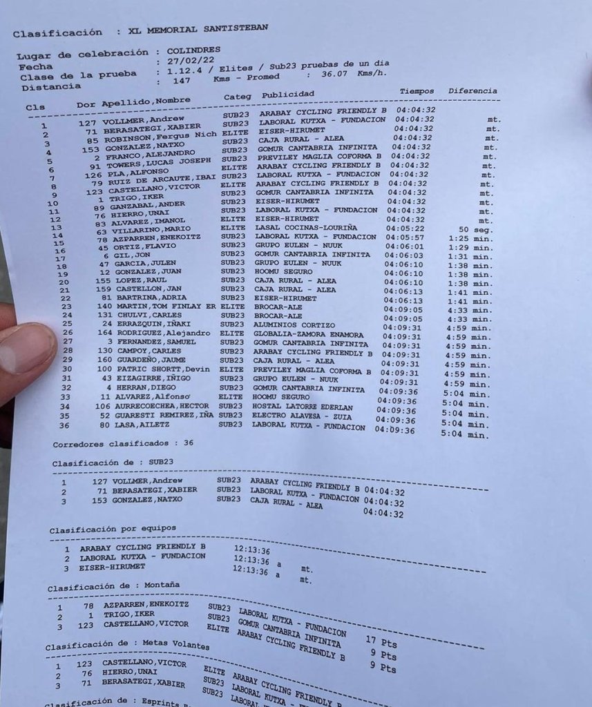 Andrew Vollmer (Ararabay Cycling) se ha impuesto hoy en el XL Memorial Santisteban disputado en Colindres. Ha sido el más rápido en un grupo de trece corredores que han llegado escapados a meta. Xabier Berasategi (Laboral Kutxa) ha sido segundo y Fergus Nich Robinson (Eiser), tercero. Tom Martín y Carles Chulvi, del Brocar Alé, y Jaume Guardeño (Filial Caja Rural) han sido Top 30. En la primera parte de la carrera se ha producido un corte en el que se ha metido Tom Martín, mientras que Chulvi viajaba en el grupo. En el kilómetro 90 se ha producido el reagrupamiento y Martín ha pagado el esfuerzo. Carles Chulvi ha aguantado hasta a falta de un kilómetro para coronar el último puerto. De ahí a meta los dos corredores de la Fundación Benicadell se han unido y juntos han llegado a meta.