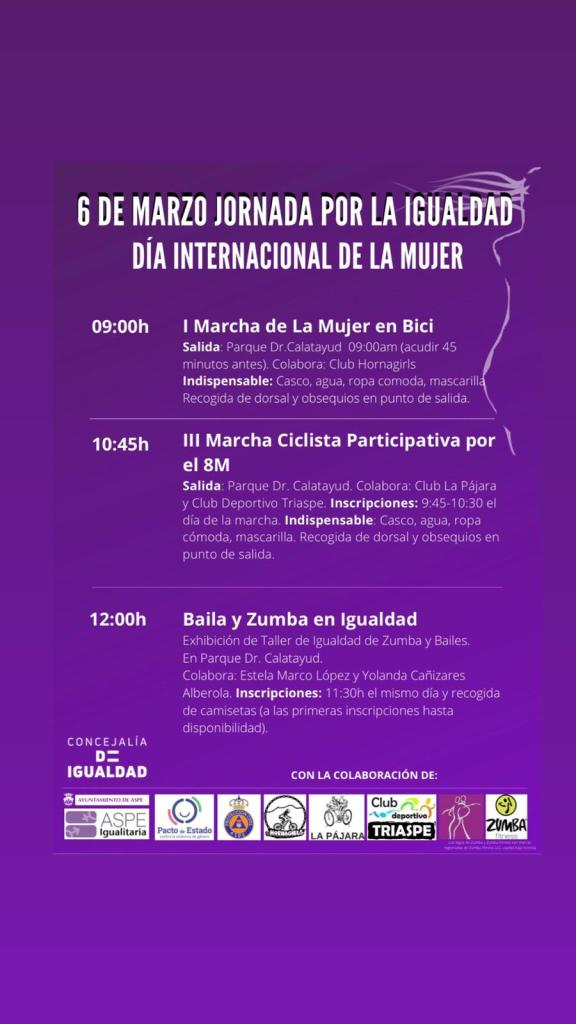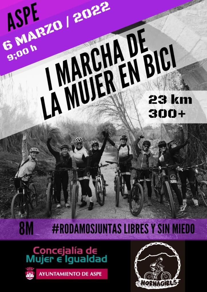 Las líderes de WomenInBike de la Federación Española de Ciclismo (RFEC) en la Comunidad Valenciana celebrarán este fin de semana el Día de la Mujer bajo el lema “Sí somos, sí estamos”. Se han preparado diversos actos en Alicante, València y Castellón que van a dejar claro que la mujer también en protagonista en el mundo de la bicicleta y ha venido para quedarse. El grupo ciclista aspense de féminas denominado Hornagirls, en colaboración con la Concejalía de Igualdad del Ayuntamiento de Aspe, organizan el 6 de marzo, la I Marcha de la Mujer en Bici. La salida está prevista a las nueve de la mañana desde el Parque Dr. Calatayud. Serán 120 las participantes, aunque podían haber sido 300 por el deseo de las féminas en participar, pero se puso un tope. En 24 horas se tuvieron que cerrar las inscripciones dada la demanda existente.