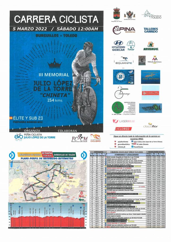 La primera prueba del fin de semana se disputará el sábado, 5 de marzo. Burguillos de Toledo acoge, a partir de las 12 de la mañana, la III edición del Memorial Julio López de la Torre ‘Chineta’. Contará con más de 180 corredores, 21 equipos y, de nuevo, con proyección nacional al ser puntuable para el ranking de la RFEC. El Brocar Alé participará con Pol Hervás, Matt Watson, Adam Robertson, Archie Peet, Camerón Preece, Max Rowley, Izán Linares y Hamish Strachan. El equipo Essax estará con Alfonso Campoy, Mikel Castella, Óscar García, Tomás Miralles, Gabriel Rojas, José Sanz, Sergio Soriano y David Torrella. Manuel Espinosa (Brócoli), Mario Granero (Drone Hopper) Josué Gómez (Drone Hopper) también se pondrán el dorsal en la citada clásica.