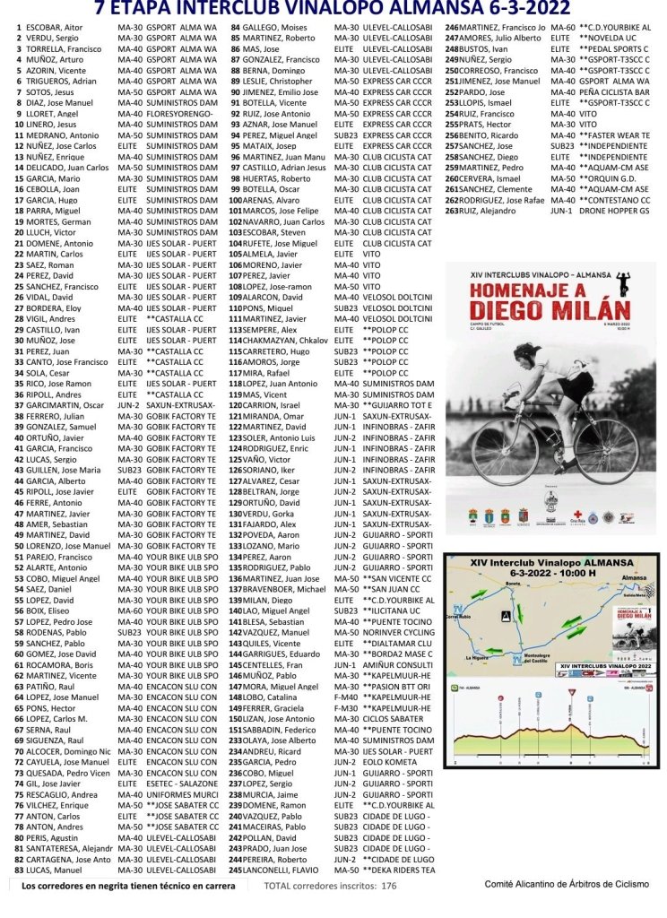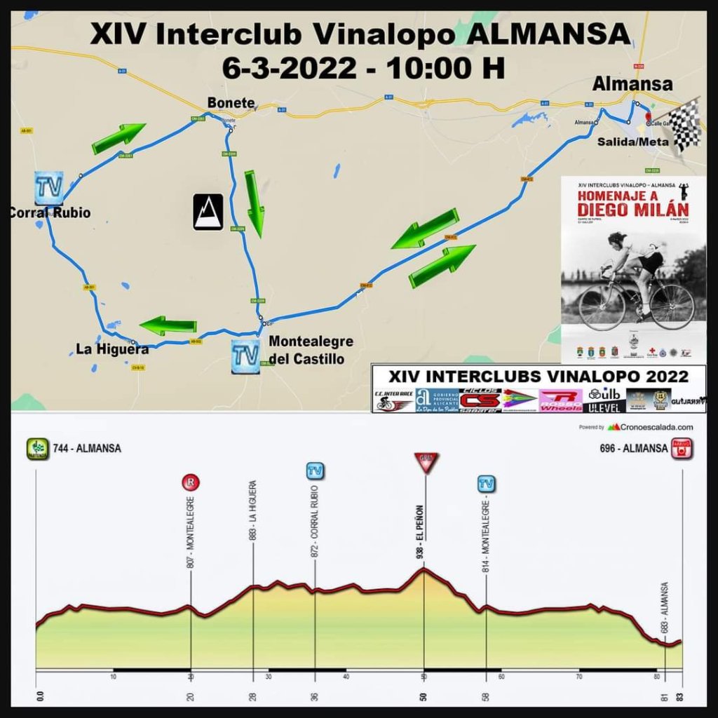 El XIV Torneo Interclubs Vinalopó regresa el domingo 6 de marzo a las carreteras de Almansa para celebrar su séptima etapa en el contexto del homenaje que rendirá a Diego Milán la Peña Ciclista El Cacho, encargada de la organización de la cita albaceteña. Cerca de 200 ciclistas partirán a las 10 de la mañana desde el Polideportivo Municipal de Almansa para afrontar los 83 kilómetros de la jornada en un recorrido prácticamente llano que les llevará dirección a Montealegre del Castillo y Corral-Rubio, localidad donde estará ubicada la Meta Volante. Tras el paso por Bonete, el pelotón afrontará la única zona montañosa de la jornada, los Altos de Bonete, dos kilómetros de subida que culminarán en el Premio de Montaña. Después de retornar a Montealegre, los ciclistas se dirigirán a Almansa con final de etapa en el Polideportivo Municipal.