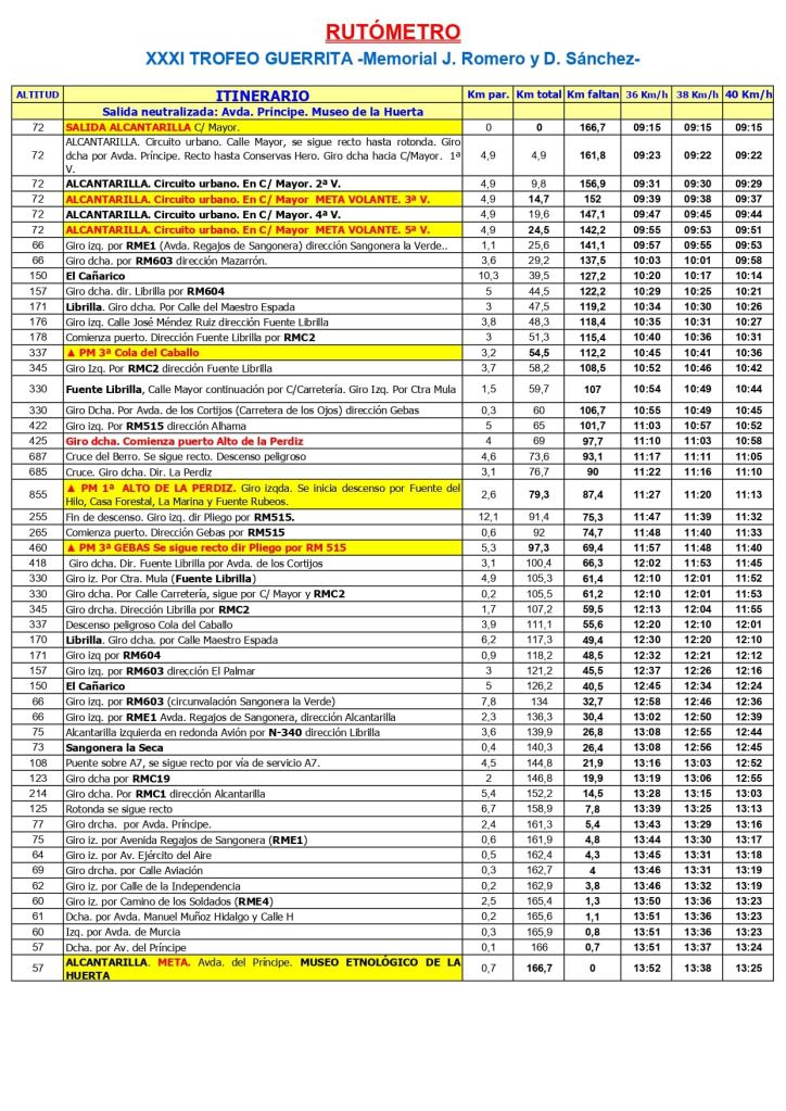 Cerca de 200 ciclistas de 26 equipos compiten hoy domingo, 6 de marzo, en la XXXI edición del Trofeo Guerrita–Memorial Juan Romero y Diego Sánchez, organizada por la Peña Ciclista Guerrita de Alcantarilla. La carrera saldrá a las 9:15 horas desde la avenida Príncipe, frente al Museo de la Huerta. El recorrido, de 167 kilómetros, consta de cinco vueltas al circuito urbano, por la calle Mayor y la avenida Príncipe con dos metas volantes, tras lo cual saldrá hacia Sangonera la Verde y Librilla, por Fuente Librilla, para volver de nuevo a Sangonera la Verde, Sangonera la Seca y vuelta a Alcantarilla para iniciar el circuito urbano final.