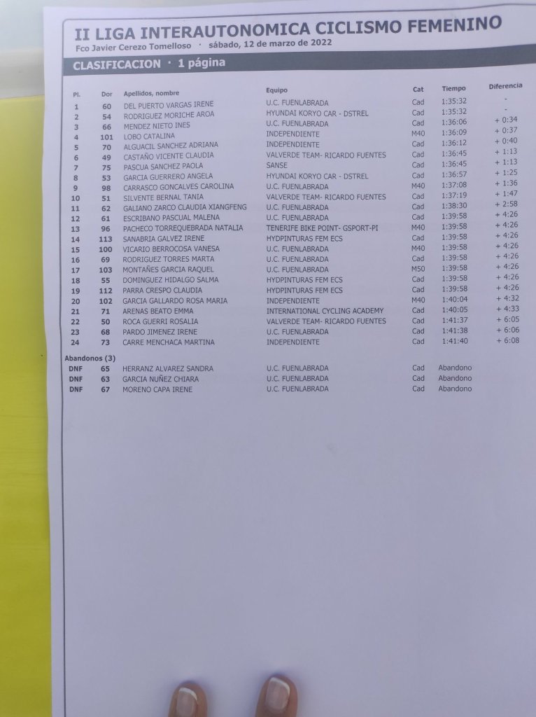 Claudia Castaño (Valverde): «No me ha gustado mucho porque había un tramo de tierra y estaba medio mojado y existían peligro de caída. Después, había una zona con mucho aire en contra. En la última vuelta me he descolgado y me ha costado mucho aguantar el ritmo con el viento. Al final, quinta. Está muy bien, pero pienso que pude quedar mejor».