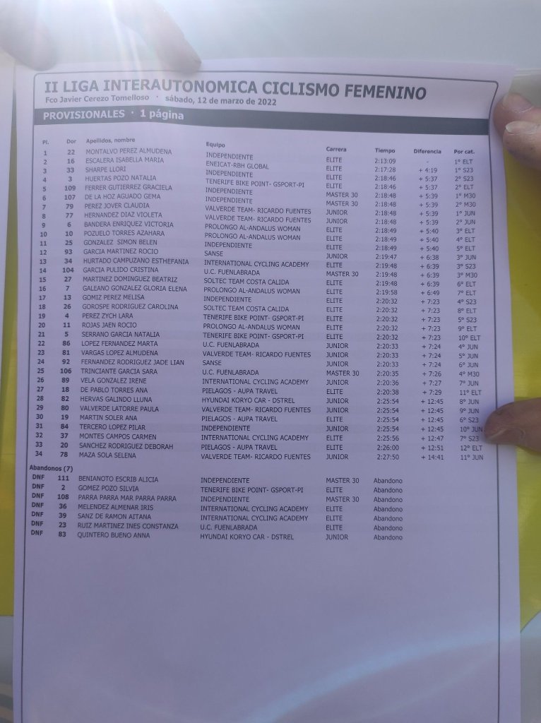 Triunfo en la categoría júnior de la alicantina Claudia Pérez (Valverde). Ha terminado séptima en la carrera. Su compañera de escuadra Violeta Hernández ha sido segunda y Rocío García (Sanse) ha sido tercera. Es la primera victoria en la categoría de Claudia.