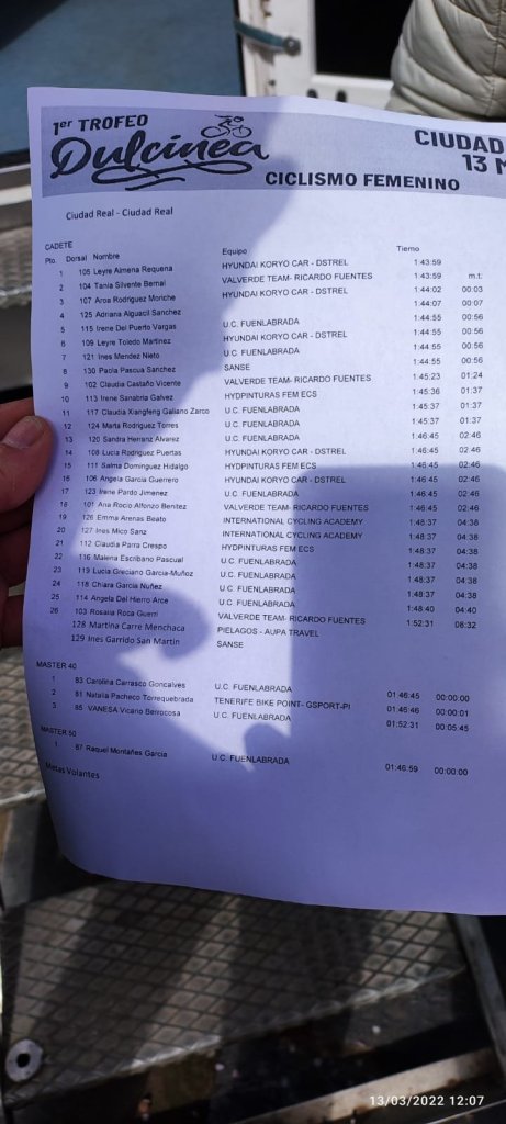 Claudia Pérez, que ganó el sábado en Tomelloso la carrera júnior, confesaba tras su triunfo en Ciudad Real: «Estoy muy ilusionada y contenta de este triunfo, todo gracias al maravilloso equipo que tengo. Somos una gran familia. El fin de semana tanto mío como del equipo ha sido redondo. Estoy muy agradecida a todas mis compañeras y a mi director Antonio Iniesta. También a mi entrenador David Lidón. Me ha hecho mucha ilusión estos dos triunfos en Tomelloso y Ciudad Real porque es mi primer año como junior y estoy consiguiendo muchos triunfos».
