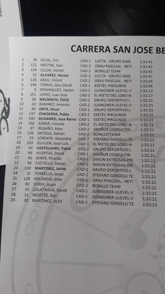 Eric Igual (Lucta Grupo Simes) se ha impuesto hoy en Beneixama en la XXXIV Carrera Ciclista de Sant Josep. Su tiempo en meta ha sido de una hora, 31 minutos y 41 segundos, Xavi Mestre (Grau Pascual) ha terminado segundo y Héctor Celda (Bonillo Team), terceeo. Héctor Álvarez, compañero de equipo del ganador, ha firmado una cuarta plaza. Sexto puesto para José David Tomás (Esetec Pikolinos) y noveno para Oleg Melnikov (GD Llopis). Destacar también en el Top 20 a Óscar Orts (GD Llopis-11º), Pablo Chazarra (Esetec-12º), José Ramón Guijarro (Esetec-13º) y Pablo Castellano (GD Llopis-19º). Buen comienzo de temporada para los corredores cadetes alicantinos.