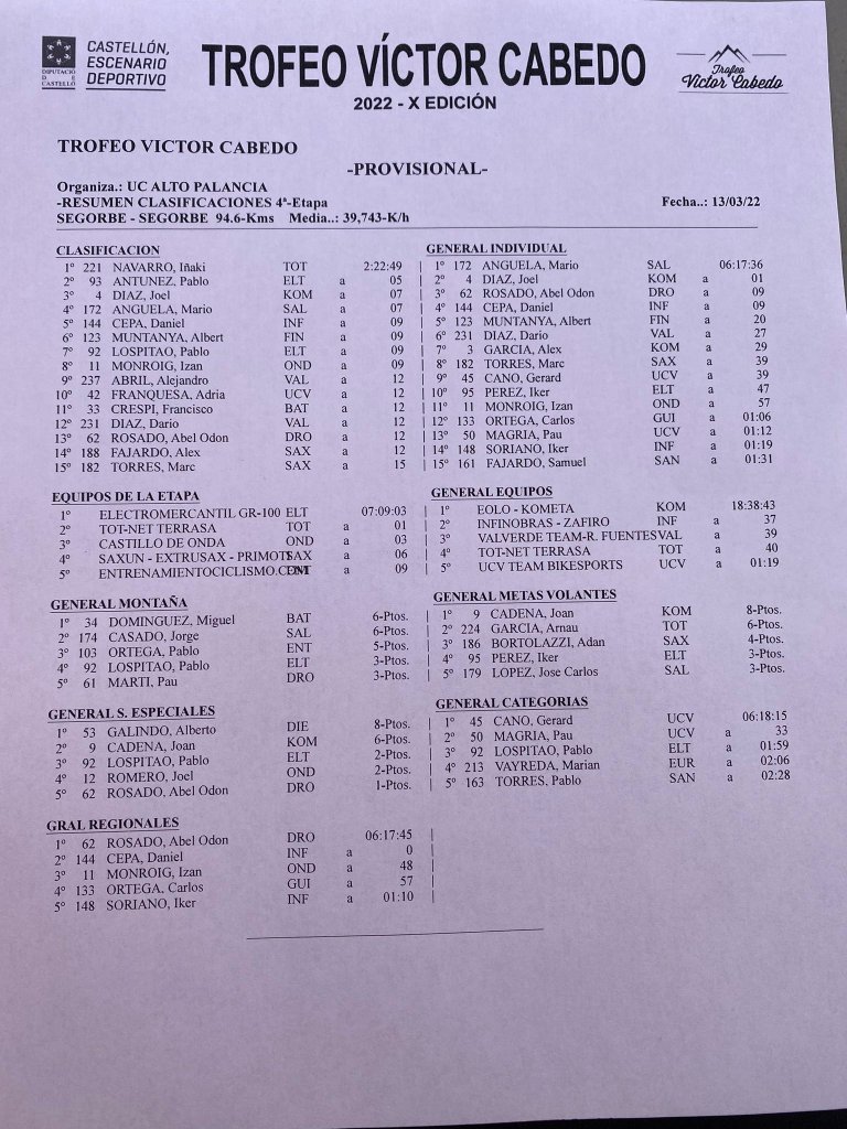 Hoy se ha puesto el punto y final al Víctor Cabedo con el XXXIV Trofeo Entrada de Toros y Caballos de Segorbe. Tras 94, 6 kilómetros de recorrido Iñaki Navarro (Tot Net Terrassa) se ha impuesto en la última jornada y Mario Anguela (SAL), la general. Quinto puesto en la jornada para Dani Cepa (Infinobras), que ha finalizado cuarto de la clasificación general, con el mismo tiempo que Abel Odón Rosado, que ha sido tercero. Top 15 para los corredores del Saxun Álex Fajardo y Marc Torres. El Eolo Kometa ha ganado por equipos, con el Infinobras segundo. Miguel Domínguez se ha llevado la montaña; Alberto Galindo los esprints intermedios; Joan Cadena, las metas volantes; y Abel Odón Rosado se ha llevado el maillot del primer valenciano, con Dani Cepa, segundo.