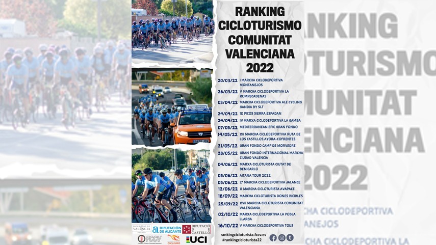 Un total de 17 pruebas formarán parte esta temporada 2022 del Ranking de Cicloturismo de carretera de la FCCV. Se trata de la Marcha Ciclodeportiva de Montanejos (20 de marzo), la Marcha Ciclodeportiva La Rompecadenas (26 de marzo), la Marcha Ciclodeportiva Ale Cycling Gandia by SLT (3 de abril), la 10 Picos Sierra de Espadán (24 de abril), la Marcha Ciclodeportiva La Gamba (24 de abril), la Mediterranean Epic Gran Fondo (7 de mayo), La Marcha Ciclodeportiva Ruta de los Castillos Ayora – Cofrentes (14 de mayo), el Gran Fondo Camp de Morvedre (21 de mayo), el Gran Fondo Internacional Marcha Ciudad de Valencia (28 de mayo), la Marxa Cicloturista Ciutat de Benicarló (4 de junio), la Aitana Tour 2022 (5 de junio), la Marcha Ciclodeportiva Jalance (5 de junio), la Marcha Cicloturista AVAPACE (12 de junio), la Marcha Cicloturista Dones Bicibles (18 de septiembre), la Marcha Cicloturista Comunitat Valenciana (25 de septiembre), la Marxa Ciclodeportiva La Pobla Llarga (2 de octubre) y la Marcha Ciclodeportiva Tous (16 de octubre).