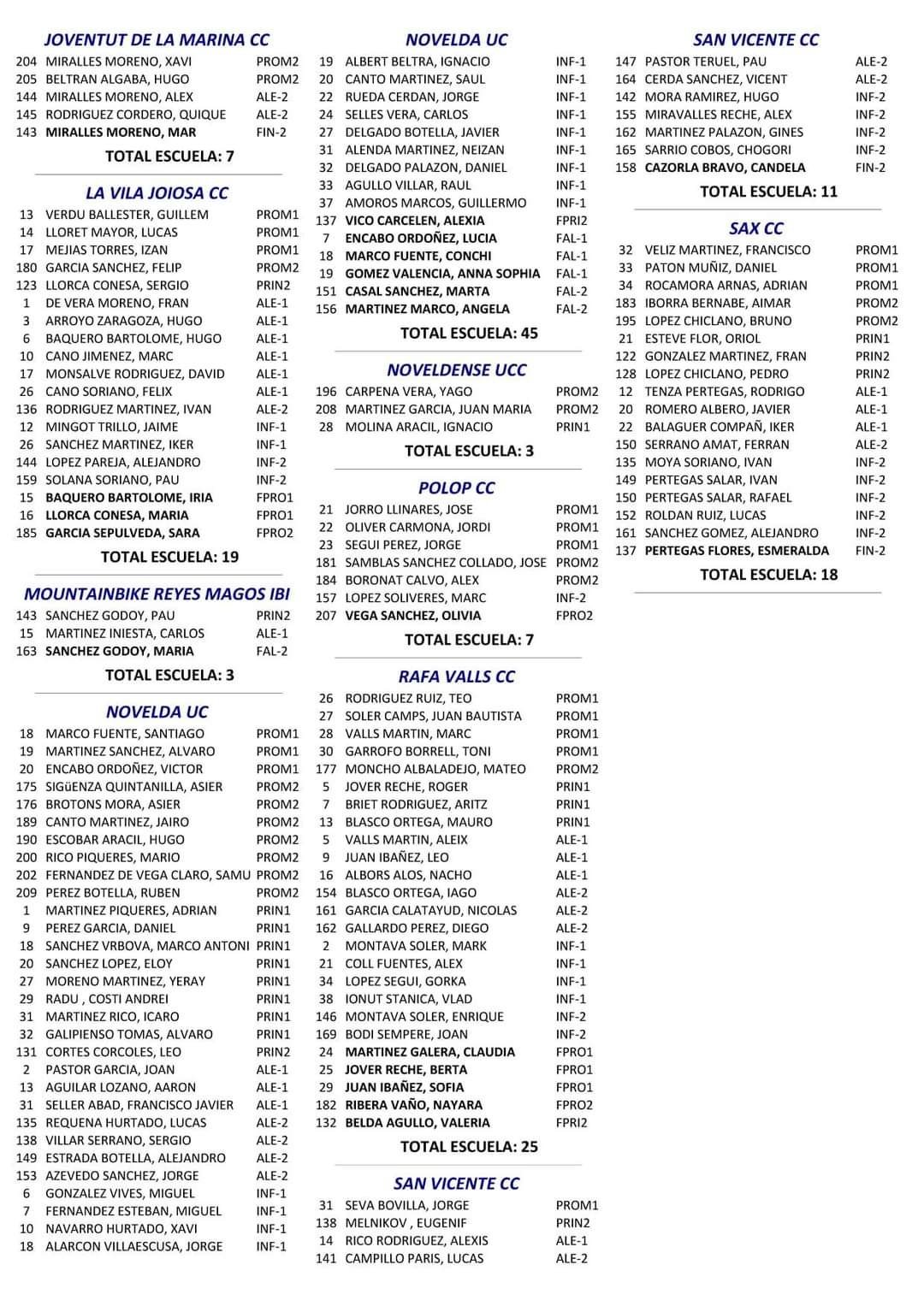 De cara a la temporada 2022 existen 273 ciclistas inscritos repartidos en las siguientes escuelas dispuestas a competir en carretera y BTT: Aitana (1), Alfaz del Pi (11), Almoradí (20), AM Sonido-Energym (16), Bankal Bike La Xara (1), Beniel (2), Benissa (9), Bernia Xaló (15), Bike Park Costa Blanca (1), BMX Alcoy (5), Crevillent (25), El Fenoll Benissa (1), ElxEnduro (1), Ijes Solar-Puertas Castalla (7), Unión Ciclista Ilicitana (13), Jávea (6), Fundación José Sabater (1), Joventut de La Marina (7), La Vila Joiosa (19), Mountain Bike Reyes Magos Ibi (3), Novelda UC (45), Noveldense UCC (3), Polop (7), Rafa Valls (25), San Vicente (11) y Sax (18).
