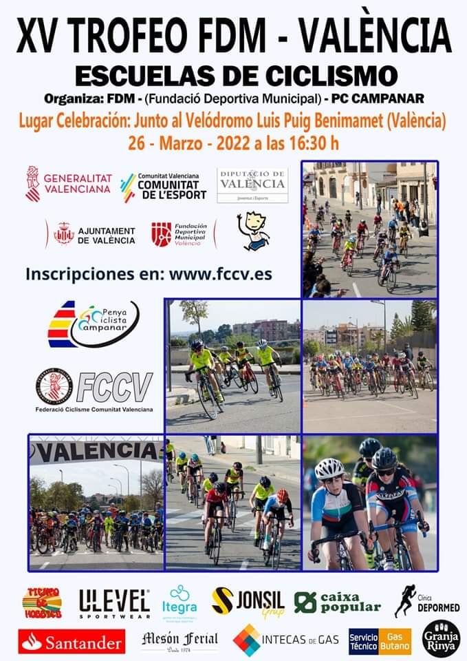 El próximo 26 de marzo se celebrará el XV Trofeo FDM-València, prueba para la categoría de Escuelas de Ciclismo. Al igual que en anteriores ediciones las distintas carreras se celebrarán junto al Velódromo Luis Puig en Benimamet-València. Las pre-inscripción finalizará el 24 de marzo de 2022, a las 20.00 horas. No obstante, desde la Peña Ciclista Campanar y de la Fundación Deportiva Municipal, organizadores del evento deportivo, ruegan a los clubes a que se apunten lo antes posible con el fin de poder preparar unos obsequios que «queremos hacer a todos los participantes».