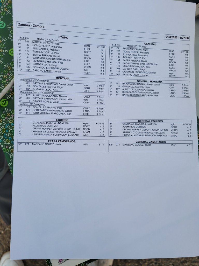 «Me hubiera gustado ganar, pero al menos después de tanto problema, esto me da moral. Me han dejado bien colocado los de mi equipo. Pero un sprint siempre es loco si no vas ‘sobrao’… Me quedado un poco encerrado y cuando he podido sprintar no he podido remontar. Pero bueno, me da moral para el lunes darlo todo en Ontur», explicaba Gómiz.