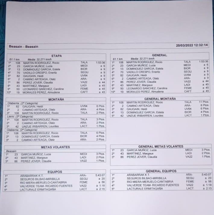 En lo que respecta a la categoría junior, la prueba no se decidió hasta los instantes finales. El pelotón se mantuvo compacto en los primeros pasos por Olaberría y Liernia, y no fue hasta la última cota puntuable donde los ataques se produjeron. Lucía García (Costa Brava), Estela Domínguez (Bioracer), Eneritz Vadillo (Seguros Bilbao-Miribilla), Heidi Gaugan (URT) y Olatz Camino (Arabarrak) fueron las más fuertes en el alto de Olaberría y se jugaron la victoria final en un sprint en la línea de meta de Beasain. En ese caso, la punta de velocidad de la catalana Lucía García fue netamente superior a sus rivales y fue capaz de sacar tres segundos de diferencia a sus cuatro compañeras de escapada, con Estela Domínguez y Eneritz Vadillo ocupando el segundo y tercer cajón del podio, respectivamente. Cabe destacar que la prueba junior compartía recorrido con las chicas de la categoría máster, donde la victoria global final cayó de la lado de Rocío Martín (Talavera) tras una ataque en solitario a falta de 30 kilómetros de meta. Segunda en categoría máster fue Cristina García (Fuenlabrada), mientras que Mónica Sánchez (Asbike) fue tercera. En máster 40, la británica del Loro Parque Carolyn Gaskell se llevó la victoria por delante de las dos corredoras del Fuenlabrada, Verónica Palazuelos y Carolina Carrasco.