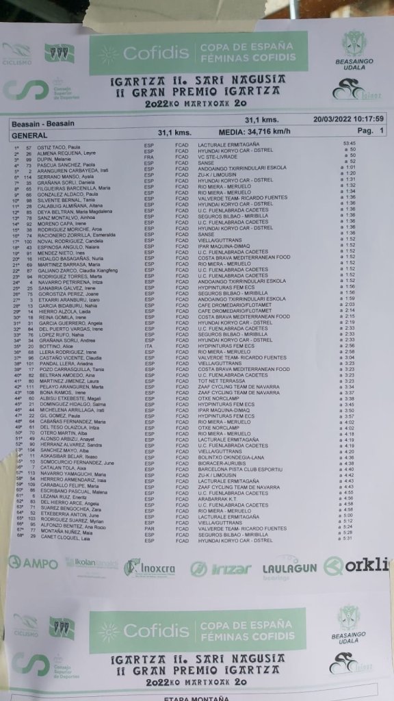 Paula Ostiz y Lucía García han sido los ganadores en la categoría cadete y júnior en la primera prueba de la Copa de España de Féminas disputada en Beasain. Buena actuación de júnior Claudia Pérez, sexta, en el Gran Premio Igartza. En cadetes, carrera de aprendizaje para Claudia Castaño, Claudia Xiangfeng, Rosalía Roca, Lucía Rodríguez y Aida Rossato. El camino es largo. Bonita la entrada en meta de Lucía Rodríguez y Rosalía Roca, juntas, tras el sufrimiento.
