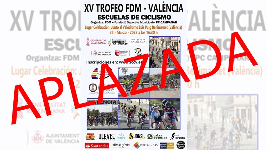 La FCCV informa que el XV Trofeo FDM Valencia, prevista para este próximo sábado 26 de marzo en Valencia, HA SIDO APLAZADA. Según informa el club organizador, la PC Campanar, en breve se comunicará nueva fecha de celebración.