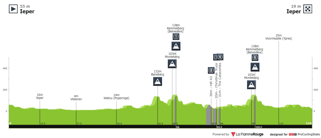 El recorrido de la Gent-Wevelgem para ciclistas de 17 y 18 años constará de 123,9 km y tendrá salida y llegada en la localidad de Ieper. El pelotón de la prueba belga no encontrará hasta el km 60 la primera dificultad en forma de cota, con la presencia del Baneberg. En los 8 kilómetros siguientes tendrán que afrontar de forma consecutiva el Monteberg y el Kemmelberg, que cuenta con el piso adoquinado. Al alcanzar el kilómetro 80, tras un tránsito por un terreno quebrado, encadenaran tres tramos de pavés antes de llegar a la zona decisiva de la carrera. A falta de 25 km para la conclusión ascenderán el Monteberg y posteriormente de nuevo el Kemmelberg, que debería seleccionar definitivamente quienes lucharán por la victoria en la meta de Ieper.