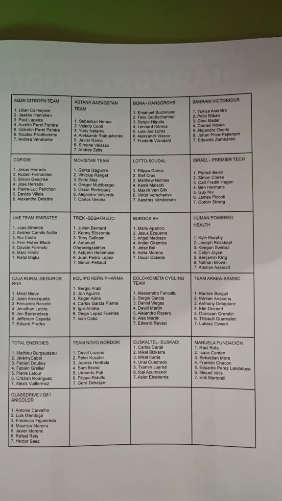 El Gran Premio Miguel Induráin, que ha sido presentado hoy, contará con la participación de 22 equipos: los World Tour Ag2r, Astana, Bahrain, BORA, Cofidis, Lotto, Movistar, Israel, UAE y Trek-Segafredo. Los pro team españoles Burgos-BH, Caja Rural, Euskaltel, Kern Pharma y además los continentales Manuela Fundación, Glassdrive y Radio Popular Boavista. Además de Valverde estarán Buchmann e Higuita (Bora), un potente UAE con Almeida, Costa y Majka, Bilbao y Maer (Bahrain), Clarcke (Israel), entre otros.