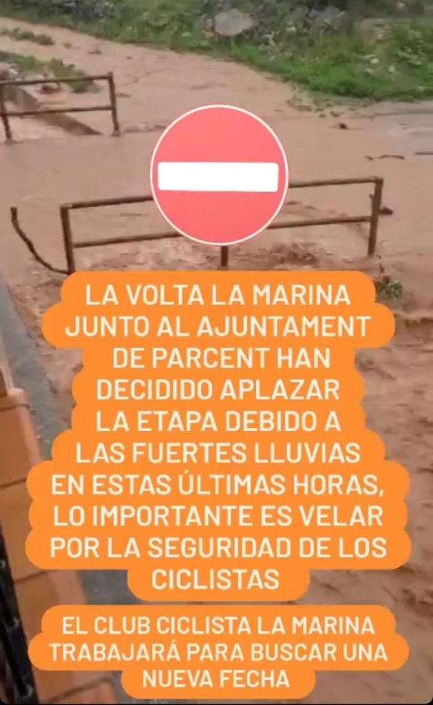 La organización de la Volta a La Marina, en colaboración del Ayuntamiento de Parcent, han decidido suspender la última etapa de la Volta La Marina que se iba a disputar el domingo, día 27, debido a las lluvias caídas últimos días en la zona. «Lo importante es velar por la seguridad de los ciclistas», ha señalado antes de confesar que «se está trabajando para buscar una nueva fecha»