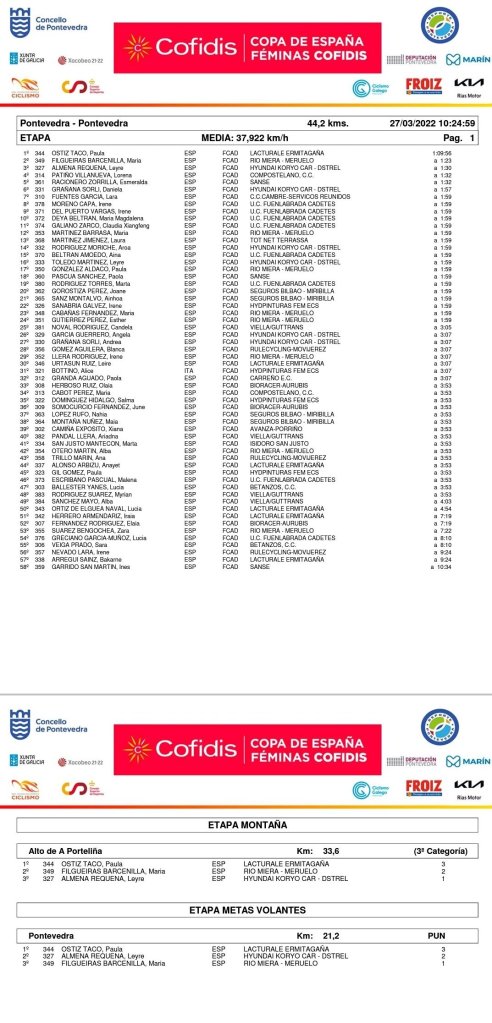 Paula Ortiz (Lacturale Ermitagaña) ha sido la ganadora, en la categoría cadete, de la segunda prueba de la Copa de España Féminas Cofidis que se ha disputado en Pontevedra. Han completado el podio María Filgueiras (Río Miera) y Leyre Almela (Hyundai Koryo). Claudia Xiangfeng (Fuenlabrada) ha sido undécima y Leyre Toledo (Hyundai Kory) ha termninado en el puesto 16. Paula Ortiz se ha impuesto también en las metas volantes y la montaña.