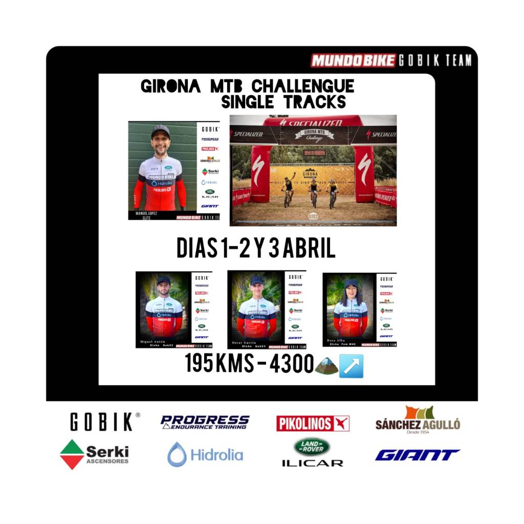 Los bikers del equipo Mundobike disputan a partir de mañana, día 1 de abril, y hasta el domingo, la Girona MTB Singletrack. Tres días de puro MTB con tres recorridos marcados a la perfección en los que los participantes disfrutarán del paraíso singletrack. En la rampa de salida estarán Manuel López, Miguel Antón, Óscar García y Rosa Alba. López competirá a nivel individual; Óscar y Miguel, en la modalidad de parejas; y Rosa, en la de mixta.