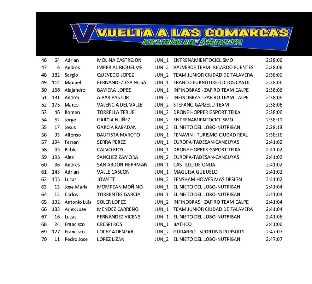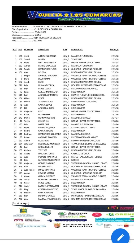 Jordi Artigues (Manuela Fundación) se ha impuesto en la última etapa de la V Vuelta a Las Comarcas – Región Murcia tras 101 kilómetros de recorrido con comienzo y final en Alcantarilla. Savelli Laptev (Team Vino) ha terminado segundo y Marc Mestre (Drone Hopper), tercero. Oliver Peace (Fensham) ha sido el ganador final. El equipo Saxun no ha tomado la salida ya que las caídas los han dejado KO. Pedro Cámara, Óscar Garcimartín y Omar Miranda abandonaron tras sufrir caídas y Gorka Verdú, David Ortuño y Jaume Muñoz, enfermos.