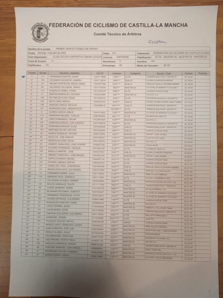 Javier Hernández (Tenerife Bike Point) fue el ganador el pasado domingo del I Trofeo Pueblo de Pepino. Por detrás de él entraron Gabriel Ochando (Globalia Zamora Enamora), Miguel Ángel Molina (Previley Maglia), Mario Villasevil (AC Hotels) y Jorge González (Avimosa), marcando un crono de 2:18:44. El ganador en sub 23 fue Elías Ferrandis (Tenerife Bike Point) se llevó el Premio de Montaña y el Máster 30 Alberto Bejarano (AC Hotels) el de Metas Volantes. El Tenerife Bike Point Pizzería fue el mejor equipo de la carrera.