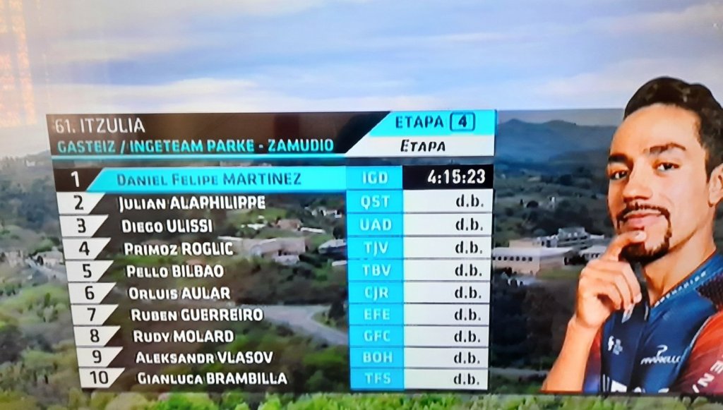 Daniel Felipe Martínez (INEOS) sorprendió con un ataque prematuro para llevarse la victoria en una meta de Zamudio que terminaba en un repecho complicado. Alaphilippe volvió a ser segundo. Primoz Roglic sigue de líder de la Itzulia tras la disputa de la cuarta etapa.