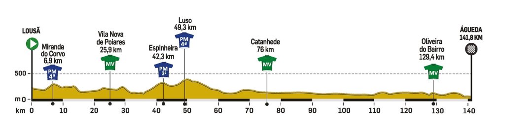 La segunda etapa tendrá salida en Lousä y meta en Águeda con 141,8 kilómetros y tres puertos puntuables de 4ª, 3ª y 4ª categoría respectivamente, que pueden propiciar una escapada que presumiblemente será abortada por el pelotón en los más de 90 kms restantes desde el último paso de montaña hasta meta que son completamente llanos. La victoria de etapa se presume en un siempre peligroso sprint.