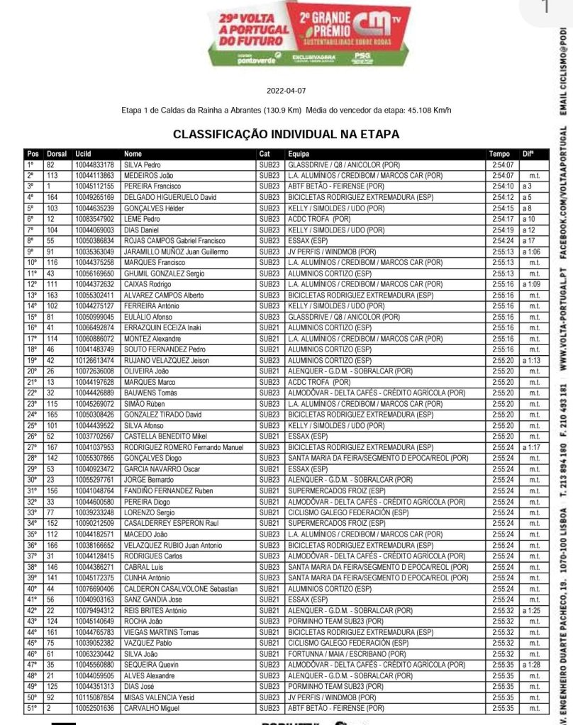 Pedro Silva (Glassdrive) ha sido el ganador de la primera etapa de la 29ª edición de la Volta a Portugal do Futuro para corredores Sub 23 disputada entre Caldas da Rainha y Abrantes, de 130,9 kilómetros de recorrido. Silva, ha batido a João Medeiros (LA Alumínios-Credibom-Marcos Caro), que ha entrado a su lado. Francisco Pereira lo ha hecho a tres segundos. El pelotón ha llegado con más de un minuto de retraso. Gabriel Rojas (Essax) ha firmado un octavo puesto, a 17 segundos del vencedor, y es tercero en la clasificación de la montaña.
