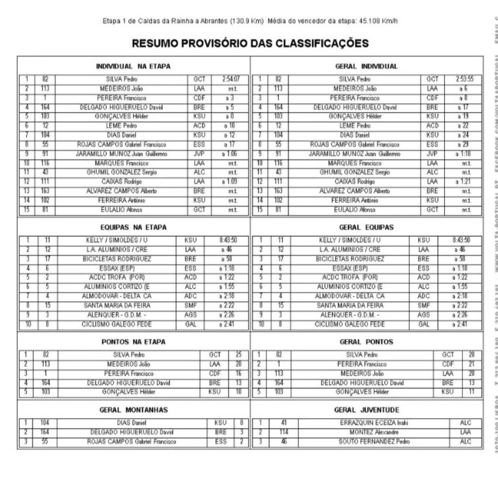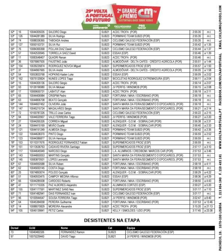 Pedro Silva, ya vencedor de la Taza de Portugal de Sub-23 esta temporada, es el nuevo líder. Gracias a las bonificaciones, dispone de seis segundos de ventaja sobre João Medeiros . El corredor de Glassdrive-Q8-Anicolor es también primero en la clasificación por puntos. Daniel Dias (Kelly-Simoldes-UDO) lidera la clasificación de la montaña; Iñaki Erraskin (Aluminios Cortizo) es el primer joven y por equipos manda el Kelly-Simoldes-UDO, con el Essax cuarto.