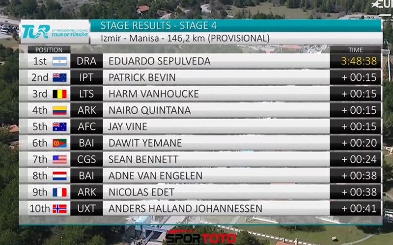 Tras tres primeros días favorables a los velocistas, la 4ª etapa del Tour de Turquía ofreció un perfil para «grimpeurs». Y en la cima de Manisa, una subida de 14,2 kilómetros con un desnivel medio del 7%, fue Eduardo Sepúlveda (Drone Hopper-Androni Giocattoli) quien levantó los brazos este miércoles. Partiendo a 4 kilómetros de la meta, el corredor argentino se impuso en solitario con 15 segundos sobre los otros favoritos incluidos Patrick Bevin (Israel-Premier Tech) y Harm Vanhoucke (Lotto-Soudal) que finalizaron 2º y 3º respectivamente. Nairo Quintana (Team Arkéa-Samsic) finalizó 4º. En la clasificación general, el ganador del día se viste de amarillo.