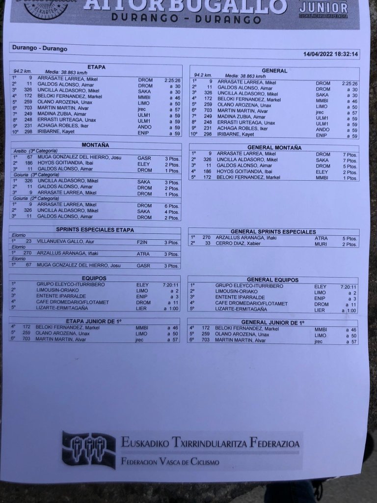 Alejandro Franco (Gomur-Cantabria Infinita) ha ganado en solitario en el Memorial Aitor Bugallo de Durango, por delante de Jorge Gutiérrez (Lizarte) y Fergus Robinson (Eiser-Hirumet). Por su parte Ander Ganzábal (Eiser-Hirumet) se coronó como campeón vizcaíno. Buena actuación de Jaume Guardeño.