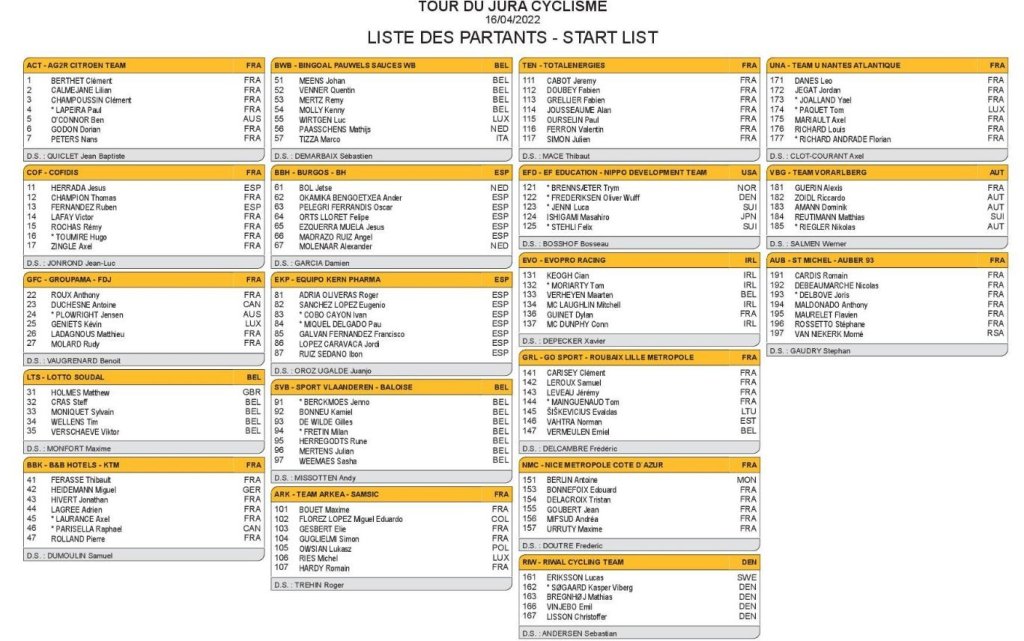 Felipe Orts (Burgos BH) y Eugenio Sánchez (Equipo Kern Pharma) participan hoy en el Tour du Jura, con 169,8 kilómetros y más de 2500 metros de desnivel entre Champagnole y Nozeroy. La salida ficticia se dará a las 10.05 horas y la real a las 10.15. La victoria fue para Benoît Cosnefroy el año pasado