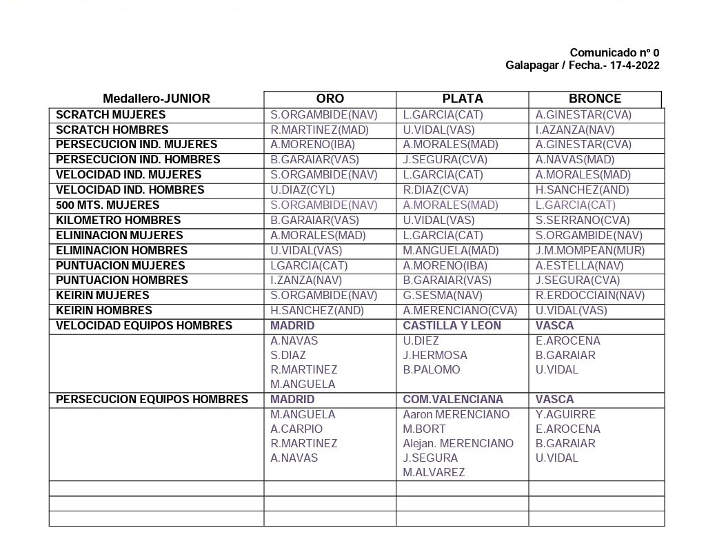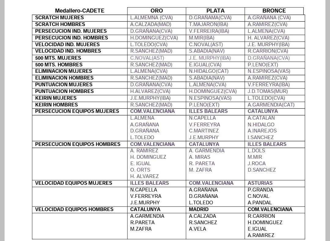 Por su parte, la noveldense dejó a todos boquiabiertos a todos en su primer año como cadete conquistando dos títulos de campeona de España. Uno en Velocidad Individual, prueba que participó porque le gustaba, aunque nunca había tenido ninguna carrera. Su superioridad fue aplastante. Y el otro, en Persecución olímpica, prueba que estaba clara que estarían en la final debido a los magníficos tiempos que hacían en los entrenamientos. Además, fue subcampeona de España en Velocidad por Equipos, junto a Andrea y Daniela Grañana. Y para terminar los campeonatos consiguió otra meritoria medalla de bronce en Keirin a pesar de que ya estaba mermada físicamente por tanta competición. Dos oros, una plata y un bronce. Una medalla por cada prueba que ha participado. Y por si fuera poco, en las clasificatorias de la velocidad marca el mejor tiempo, 12.586, y batió el récord de España establecido en 2017.