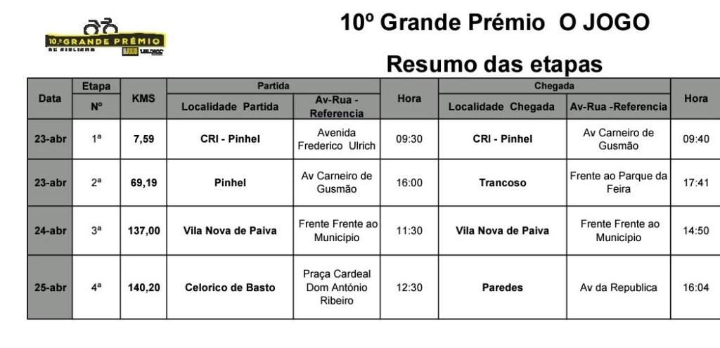 La prueba lusa se inicia el sábado con un doble sector. Primero, una contrarreloj individual de 7,59 kilómetros en Pinhel. Y por la tarde, el pelotón deberá recorrer 69,19 kilómetros con salida en Pinhel y meta en Trancoso. El domingo, día 24 de abril, la etapa contará con 137 kilómetros y Vila Nova de Paiva acogerá a los corredores. La prueba finalizará el lunes, con una jornada de 140,20 kilómetros, que saldrá de Celorico de Basto y Basto terminará en Paredes.