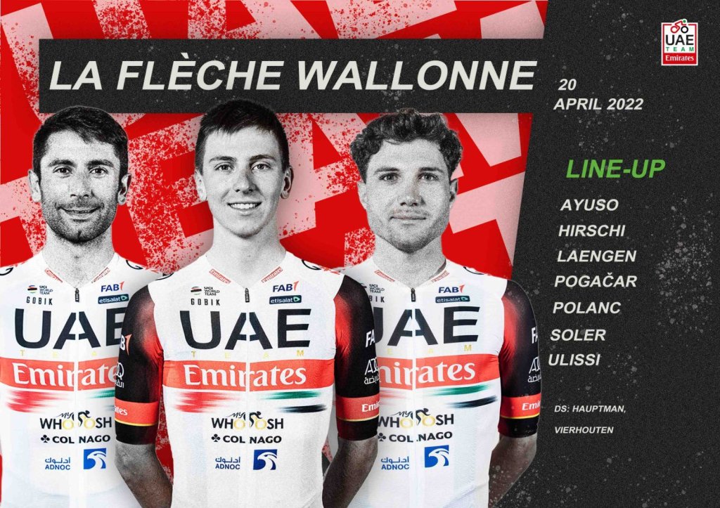 Juan Ayuso participa hoy con el UAE Team Emirates en la Flecha Valona 2022 que se disputa en Bélgica. Estará acompañado por Marc Soler, el italiano Diego Ulissi, los eslovenos Tadej Pogacar y Jan Polanc y el noruego Vegard Stake Laengen. Participarán los 18 equipos WorldTour, siendo Movistar el único español, a los que se suman por derecho los tres mejores equipos profesionales de la clasificación de la temporada pasada: Alpecin-Fenix, Arkéa-Samsic y TotalEnergies. Los cuatro invitados son B&B Hotels, Bingoal Pauwels, Sport Vlaanderen y Uno-X Pro Cycling.