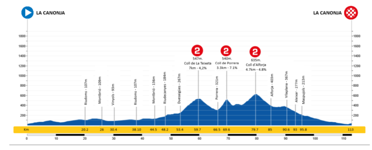 La prueba tarraconense, que tendrá salida y meta en la localidad de La Canonja, propone un trazado quebrado de 113 kilómetros que, comenzará con una primera hora de carrera de perfil llano. Tras este primer bucle más urbano, los ciclistas se dirigirán hacia el interior, camino de un encadenado de tres puertos de segunda categoría, comenzando con el Coll de la Teixeta (7 km al 4,2%), que se supera en el kilómetro 60 de carrera. Posteriormente, se subirá al Coll de Porrera (3,3 km al 7,1%) y al Coll d’Alforja (4,7 km al 4,8%), coronándose este último a 33 kilómetros de meta. A partir de ahí, terreno nuevamente favorable hasta la meta final en La Canonja. El pelotón del Trofeu 15 d’Abril recibirá la salida a las 15 horas.