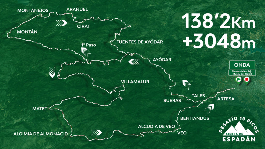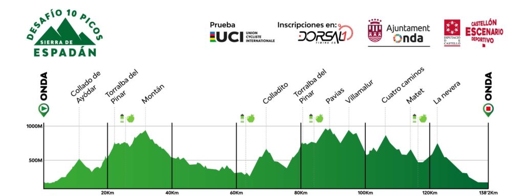 Los más de 600 inscritos en esta II Edición del ‘Desafío 10 Picos Sierra de Espadán’ tendrán que atravesar un duro recorrido hasta llegar a la línea de meta en Onda, atravesando un total de 10 puertos de montaña a través de cerca de 20 localidades de la provincia de Castellón. Onda, Torralba del Pinar, Tales, Sueras, Torrechiva, Ayódar, Fuentes de Ayódar, Cirat, Arañuel, Montanejos, Montán, Villamur, Matet, Algimia de Almonacid, Alcudia de Veo, Veo, Benitadús y Artesa son las localidades por las que atraviesa la carrera, mientras que los puertos que deberán superar los ciclistas participantes serán los de Collado de Ayódar, Torralba del Pinar, Montán, Colladito, de nuevo Torralba del Pinar, Pavías, Villamalur, Cuatro Caminos, Matet y La Nevera. La organización de la prueba instalará hasta cuatro puntos de avituallamiento para facilitar la labor de los inscritos, uno doble en Torralba del Pinar, otro en Torrechiva y un último en Matet. Una oportunidad única para los participantes, llegados de todas partes de España, de explorar la Sierra de Espadán, uno de los enclaves naturales más espectaculares que ofrece la Comunitat Valenciana; y también para la provincia de Castellón, de enseñar al resto de España una de sus muchas joyas turísticas.