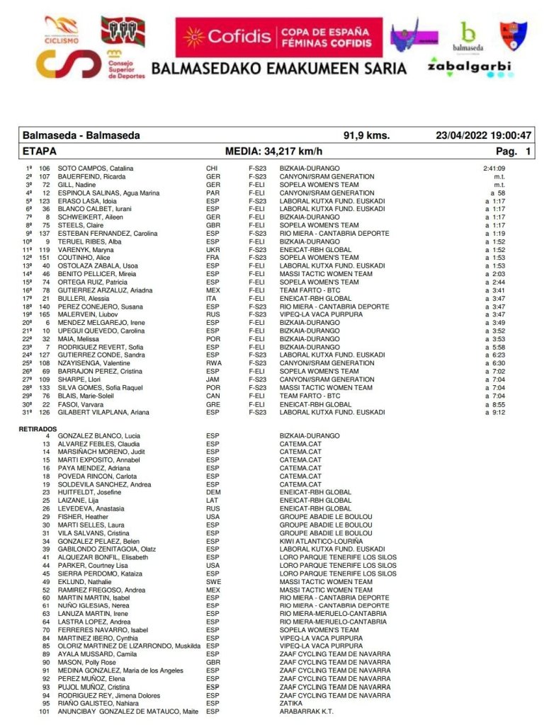 | Catalina Soto (Bizkaia-Durango) se ha hecho con la victoria en el Balmasedako Emakumeen Saria, cuarta prueba puntuable para la Copa de España. La ciclista chilena ha conseguido el triunfo por delante de Ricarda Bauernfeind (CSG) y Nadine Gill (SWT), sus compañeras de escapada, tras marchar en fuga durante la segunda parte de la carrera junto a Espínola (CSG), quien acabó la carrera entre grupos. Nadine Gill (Sopela) afianza su liderato de la competición gracias al trabajo del equipo en el que se encuentra la alicantina Cristina Barrajón. «Ha sido una jornada dura por la lluvia y al final Nadine ha sido tercera. Hemos neutralizado los diferentes ataques y en las subidas de los puertos se ha ido haciendo la selección y en la última vuelta ya el grupo final. Tras el trabajo me he centrado en llegar a meta y estoy contenta», confesaba la alteana al final de la prueba. Fue a 20 kilómetros del final cuando se formó ese grupo cabecero, tras haber sido neutralizadas previamente otras intentonas por el trabajo de Bizkaia-Durango en el pelotón. Soto se filtró en la escapada buena del día y, bajo la lluvia, fue la más rápida del terceto para lograr su segunda victoria de la temporada, segunda también para Bizkaia-Durango, tras la alcanzada en el Campeonato de Chile de contrarreloj. Además, en la clasificación por equipos Bizkaia-Durango también se llevó la victoria, segunda en cuatro carreras de la Copa, con los top-10 de Aileen Schweikart y Alba Teruel. Catalina Soto: «Estoy contentísima. Era solo un tema de confianza para mí, sabía desde el principio que podía ganar, y en especial con el equipo que tenemos, así que al fin, tener la cabeza en el lugar correcto, ha hecho que logremos la victoria como equipo, que era lo más importante. Afrontamos las siguientes carreras de la misma forma que esta, al final es todo un proceso y tenemos que creer en el equipo y en nuestras capacidades. A seguir trabajando, estamos comenzando y yo estoy aprendiendo, así que feliz, muy feliz». |