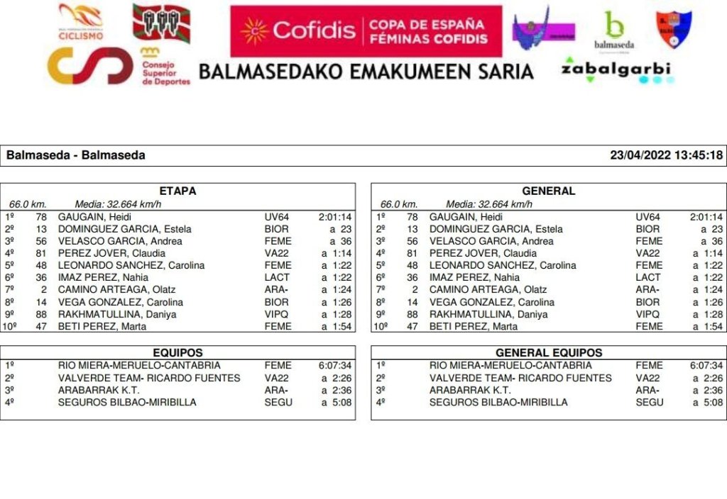 Heidi Gaugain (URT Velo 64) ha ganado en solitario en la categoría júnior en la prueba de la Copa de España Féminas Cofidis disputada en Balmaseda. Estela Domínguez (Bioracer) y Andrea Velasco (Río Miera) le ha acompañado en el podio. Cuarto puesto para la alicantina Claudia Pérez (Valverde). Domínguez se mantiene como líder. Por equipos, el Valverde de Claudia Pérez y Selena Maza ha sido segundo.