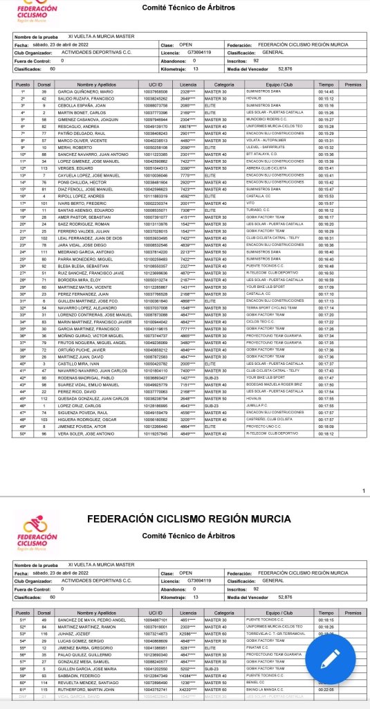 Joan Cebolla ha sido el primer élite; Pablo Ródenas (Yourbike) ha vencido entre los sub 23; Mario García Quiñonero ha sido el mejor M30; Andrea Rescaglio (Uniformes Murcia), se ha impuesto en M40; Eduard Verges (Abrera), en M50; y Jozsef Juhasz (Torrevieja), en M60.