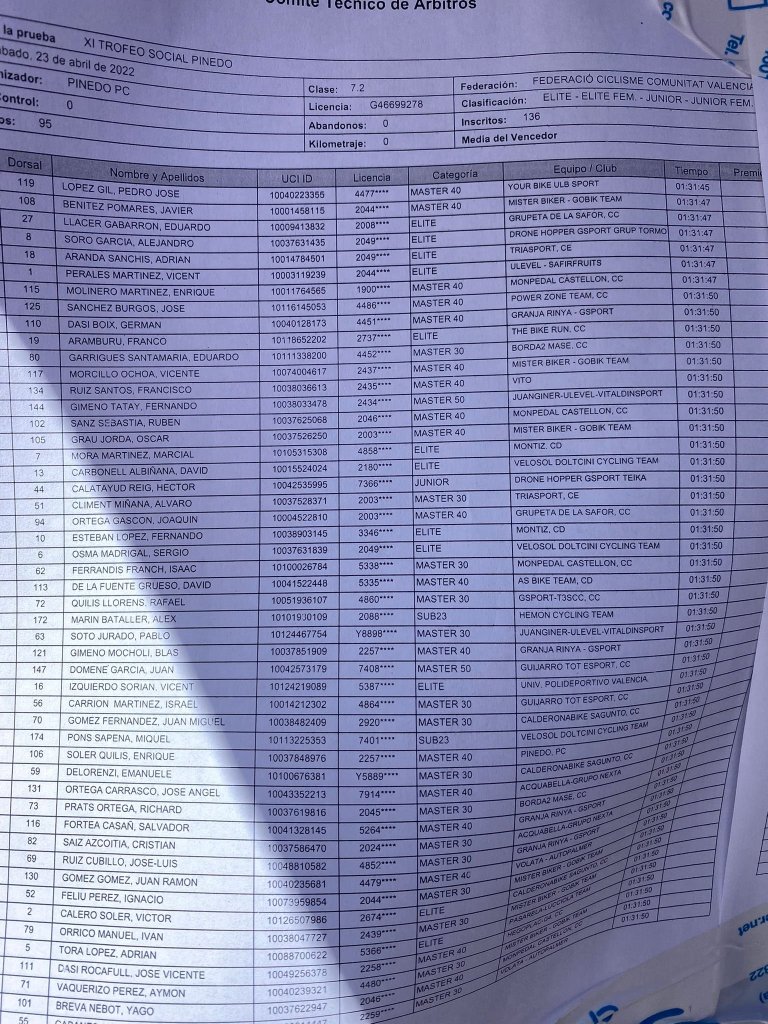 Pedro José López (Yourbike) se ha impuesto esta mañana en la undécima edición del Trofeu Social Pinedo para la categoría disputado sobre un recorrido de 60 kilómetros. El tiempo del ganador ha sido de una hora, 31 minutos y 45 segundos. Javier Benítez (Mister Biker) ha entrado a continuación a dos segundos y Eduardo Llacer (Grupeta de la Safor), tercero. Llacer ha sido el primer élite; Álex Marín (Hemon Cycling) se ha impuesto en Sub 23; Eduardo Garrigues (Borda Masé), en M30; Pedro José López, en M40; Fernando Gimeno (JuanGiner), en M50; y Héctor Calatayud (Droner), en júniors.