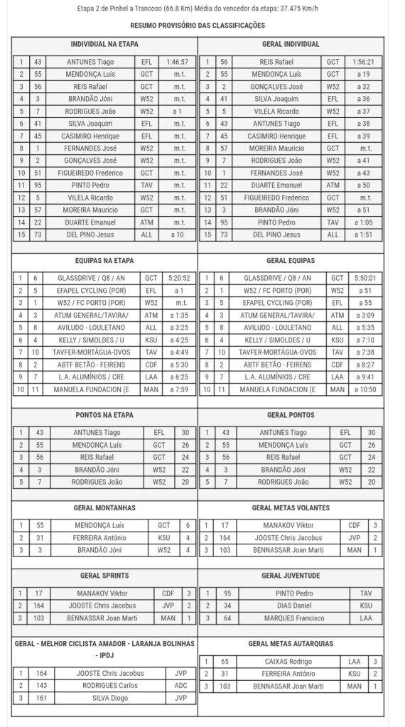 Era un grupo de unas 15 unidades que llegaban a Trancoso en cabeza. Tiago Antunes ganó la etapa, contra Luís Mendonça, Rafael Reis y Jóni Brandão (G52-FC Porto). Un corte de 1 segundo para los corredores que entraron a continuación le dio un pequeño empujón en la general a Rafael Reis. El corredor Glassdrive-Q8-Anicolor tiene 19 segundos de ventaja sobre Luís Mendonça y 32 segundos sobre José Gonçalves, perseguidores más directos. Glassdrive-Q8-Anicolor también lidera la clasificación por equipos y en la montaña, a través de Luís Mendonça. La victoria de etapa elevó a Tiago Antunes a lo más alto de la clasificación general por puntos. La escapada le dio a Viktor Manakov los maillots tanto para los goles voladores como para los sprints. Rodrigo Caixas (LA Alumímios-Credibom-Marcos Car) es el primero en las autarquias generales, Pedro Pinto (Tavfer-Mortágua-Ovos Matinados) es el mejor joven y Chris Jacobus Jooste el mejor representante de los equipos del club.