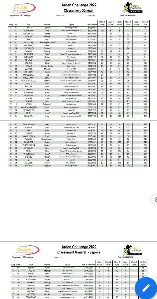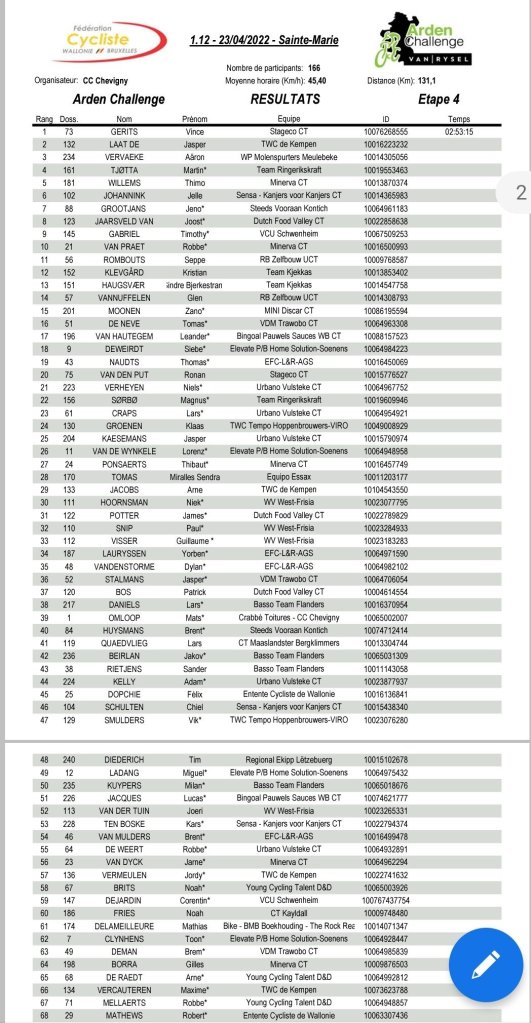 Vince Gerits (Stageco CT) ha sido el ganador de la cuarta jornada del Van Rysel-Arden Challenge que ha tenido salida y met en Sainte-Marie-sur-Semois (Étalle) tras 131 kilómetros, repartidos en tres vueltas a un circuito de 43,7 kilómetros. El pelotón ha tenido que superar en cada paso la Côte de Croix-Rouge a cada paso, la última a 10 kilómetros de la meta. Oyvind Brekke Flotten (Ringerikskraft) y Aäron Vervaeke (De Molenspurters Meulebeke) ha entrado a continuación.