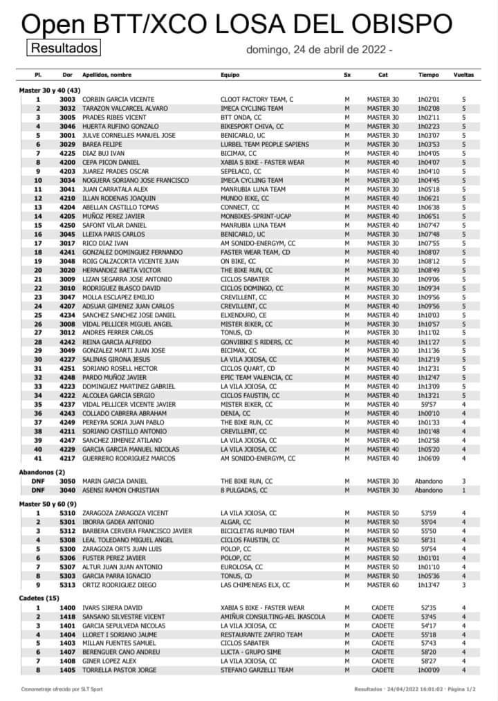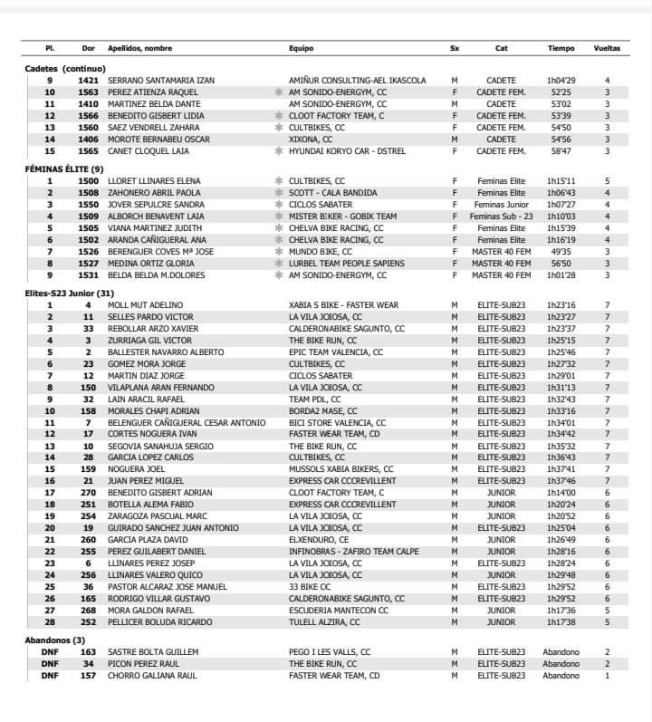 Vicente Corbín (La Fábrica) se ha impuesto en M30; Iván Díaz (Bicimax) y María José Berenguer (Mundobike), en M40; Vicente Zaragoza (La Vila), en M50; y Diego Ortiz (Las Chimeneas Elx), en M60.