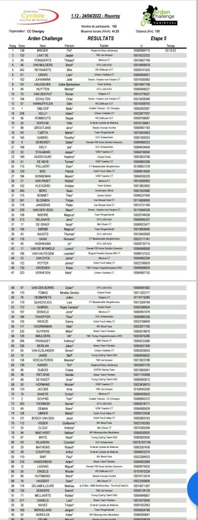 Pol Breser (Ekipp Lëtzebuerg) se impuso este domingo en la quinta y última prueba de la Van Rysel-Arden Challenge (1.12B), disputada en los alrededores de Rouvroy sobre una distancia de 132 kilómetros. Jasper De Laat (TWC de Kempen) y Thibaut Ponsaerts (Minerva Continental Team) ha completado el podio de la jornada. Martín Tjotta (Team Ringerikskraft) ha sido el ganador final.