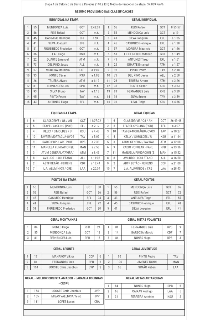 Esto fue aún más claro en la subida de segundo nivel al Cruzeiro, donde se alcanzó la última resistencia a la fuga, cuando en el pelotón comenzaron los ataques por la etapa y la general. Los muchos movimientos se extendieron hasta la siguiente montaña, a 9300 metros de la línea de meta. Entonces, Rafael Reis incluso despegó, pero al volver a entrar en la parte delantera de la carrera, tenía la victoria en el bolsillo. Pero Glassdrive-Q8-Anicolor quería algo más que ganar. Pretendía demostrar una hegemonía total. Y lo hizo. Rafael Reis y Luís Mendonça se fueron solos a la línea de meta. Mendonça fue el primero y confirmó la conquista de la clasificación por puntos. Rafael Reis llegó con los mismos 3h42m01s y selló la victoria en el Gran Premio O Jogo. Tercero, a 59 segundos, fue Henrique Casimiro (Efapel Cycling). Al final del día, Rafael Reis ganó la general con una ventaja de 19 segundos sobre Luís Mendonça. Tercero, a 1m35s, fue Joaquim Silva (Efapel Cycling). El vuelo de hoy permitió a Rádio Popular-Paredes Boavista subir al podio en la ciudad donde tiene su sede, a través de Hugo Nunes, vencedor de las clasificaciones de montaña y municipal, y Luís Fernandes, primero en las metas voladoras. Viktor Manakov (ABTF-Feirense) ganó el maillot de velocidad, Pedro Pinto (Tavfer-Mortágua-Ovos Matinados) fue el mejor joven y Chris Jacobus Jooste (JV Perfis/Windmob) fue el mejor integrante de los equipos del club.